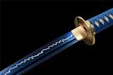 Tsuka(Handle): Genuine Rayskin wrapped with blue Japanese cotton Ito with Menuki (ornament);